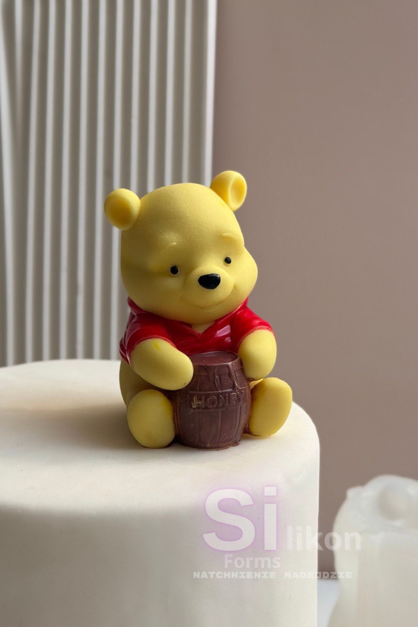 Uroczy Kubuś Puchatek z beczułką miodu to idealna dekoracja do tortów urodzinowych, słodkich stołów i deserów dla najmłodszych.